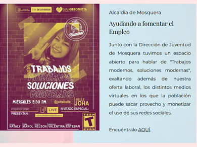 Junto con la Dirección de Juventud de Mosquera tuvimos un espacio abierto para hablar de trabajos modernos y soluciones modernas, exaltando además de nuestra oferta laboral, los distintos medios virtuales en los que la población puede sacar provecho y monetizar el uso de sus redes sociales.